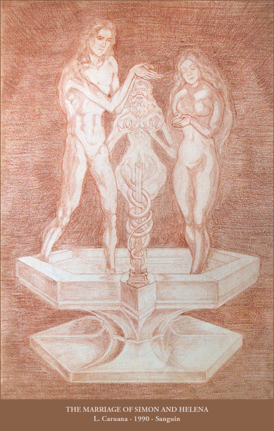 The Marriage of Simon and Helena is a wedding portrait I made for me and my girlfriend at the time, based on the Gnostic myth of Simon Magus and his consort Helena. In the drawing, our union is blessed by Tiresias, the blind poet who lived as a woman for seven years. The candle-lit ceremony takes place in the baptismal Bridal Bath.