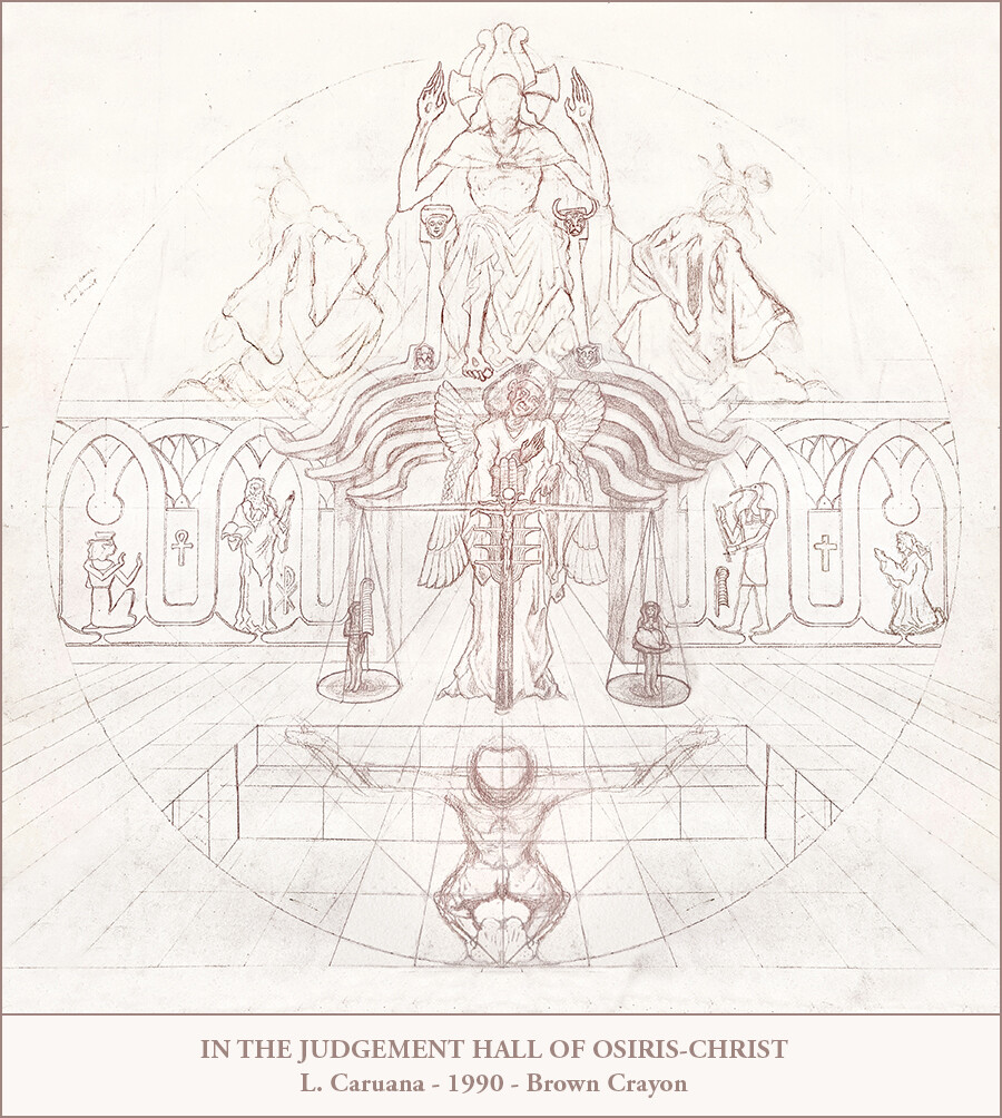 Next is the unfinished In the Judgement Hall of Osiris-Christ. This was the first time I'd combined myths from different cultures. The Egyptians had the same vision of the Afterlife as Christianity ~ as a time of judgement, except the scales tended by the archangel Michael / Anubis do not weigh good against evil, but one's heart against Ma'at, the feather of Truth.