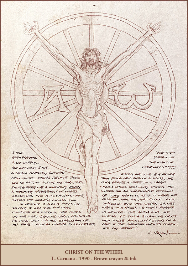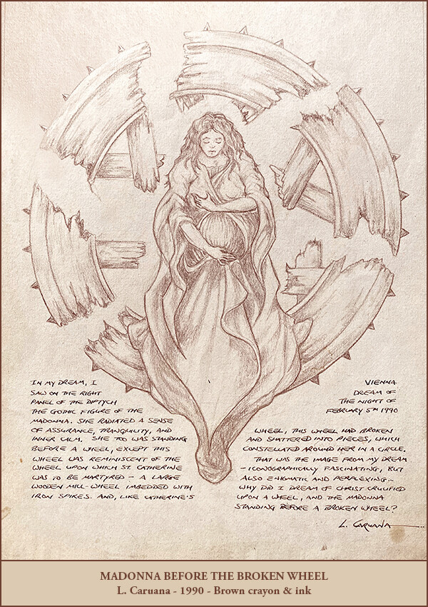 The last two drawings of Christ on the Wheel and The Madonna Before the Broken Wheel were given to me in a dream, and I sketched them the next morning. I eventually made two paintings of them called Christus Mysticus and Madonna Mystica while working in Ernst Fuchs studio in Monaco.